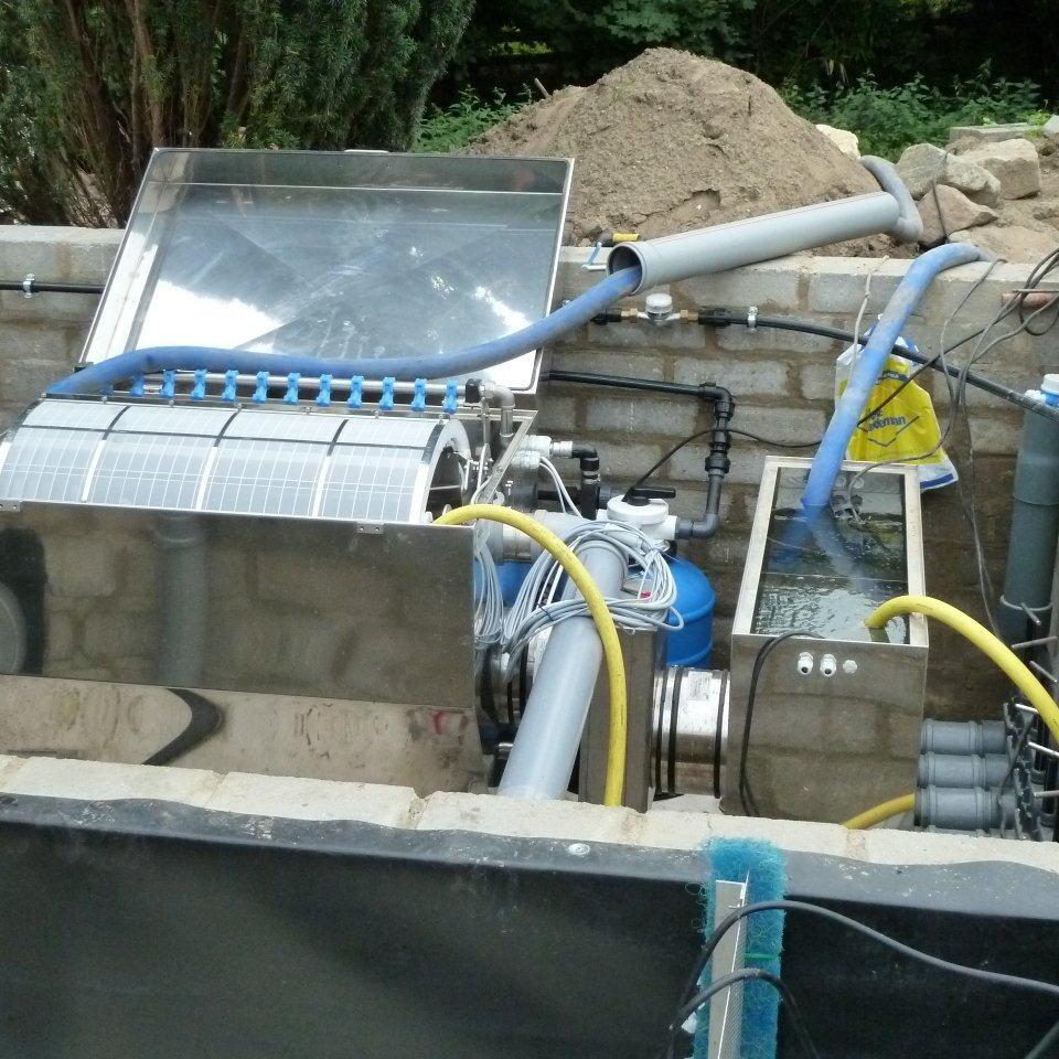 Alle drei "Biocarrier" sind durch V4A - Lochbleche innerhalb der Biokammer getrennt, die 3 Linn-Pumpen und die 2 Druckpumpen sind außerhalb der drei Biobecken installiert!