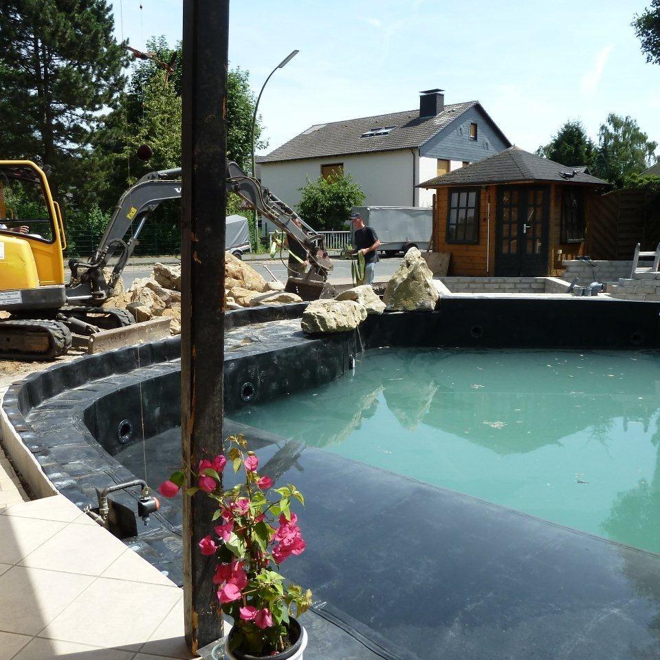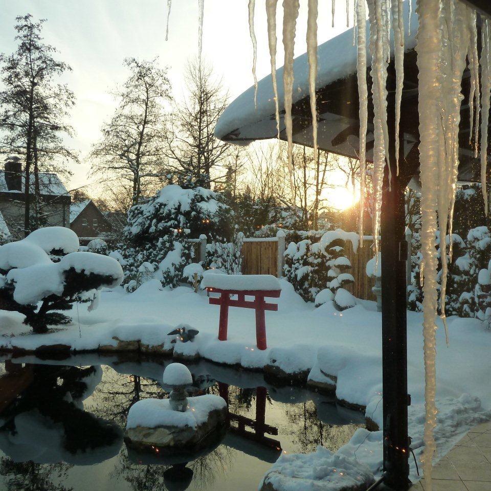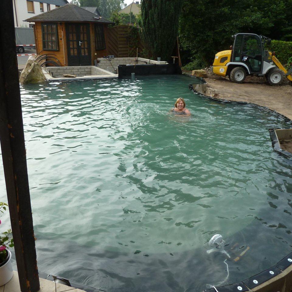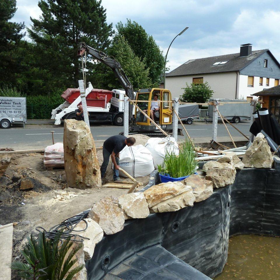 das Wasservolumen vom Koiteich beträgt 102.000 Liter, die Teichtiefe liegt bei 230cm, mit einer 80 cm tiefen Flachwasserzone.